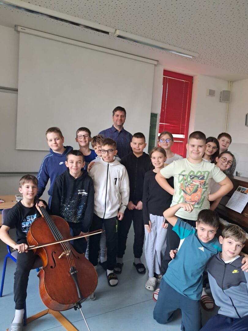 Tijekom veljače 2026. godine učenicima petih razreda kao gost u razredu u posjet je došao profesor violončela Adam Vidović. Učenici se prema kurikulu Glazbene kulture upoznaju s gudaćim glazbalima pa je ovo bila prilika da jedan od tih instrumenata – violončelo vide, čuju, dožive i probaju svirati. Taj neposredni susret s instrumentom potaknuo je znatiželju kod učenika te im omogućio lakše svladavanje nastavnog gradiva i dublje iskustveno povezivanje s glazbom.